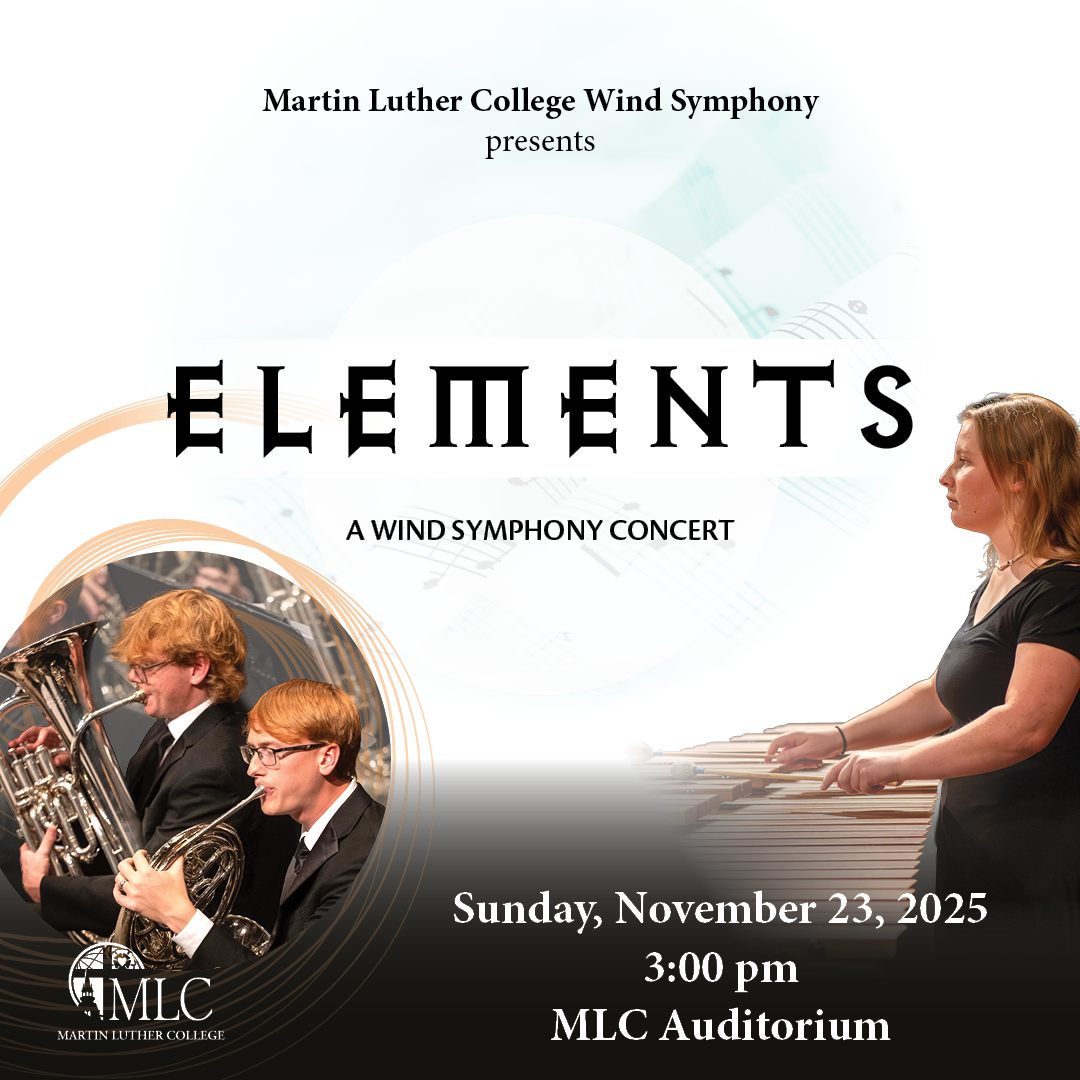 Everything in creation has elemental qualities that make it what it is. Steel is metallic and strong. Wind is invisible yet felt. How about music? Melody is a thread of pitches woven logically into something memorable. Join the Martin Luther College Wind Symphony for “Elements,” a musical exploration of the defining characteristics of creation—expressed through sound. The concert will feature three student conductors, Caleb Krahn, Josiah Smith, and Micaiah Wagner, who are studying to be future music educators. The concert is in the MLC Auditorium on Sunday, November 23, at 3 pm. Can’t make it in person? The concert will be livestreamed on MLC’s YouTube page.