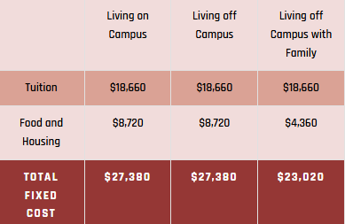 Tuition, food and housing are billed directly to each student by the Financial Services Department. To see all of the details regarding any other fees and timeline for paying your bill, please check out the Financial Services website. Off-campus students should use the Food & Housing amounts as an estimate.