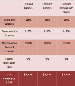 Students will have other costs while at college. Supplies are needed for different courses, items are needed for the dorm, travel back and forth from home are all things that families should plan to cover. Each student will have a different combination of variable costs based on specific needs.
