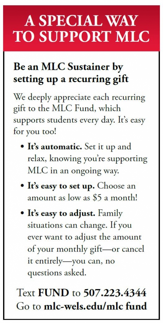SPREAD THE ENCOURAGING WORD about your WELS College of Ministry by scheduling an MLC Sunday at your congregation and by encouraging any women and men you know who have gifts for ministry.